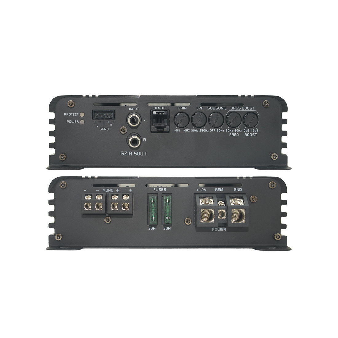 Amplificateur puissant de classe D Amplificateur de subwoofer monocanal avec circuit de classe D et filtre actif intégré Amplificateur mono Stable à 1 ohm Technologie de classe D Filtre actif variable et amplification des basses Entrée de haut niveau avec fonction de mise en marche automatique et charge fictive Alimentation stable grands terminaux Dissipateur thermique anodisé noir avec inscription Ground Zero Télécommande pour basses incluse circuit de triple protection